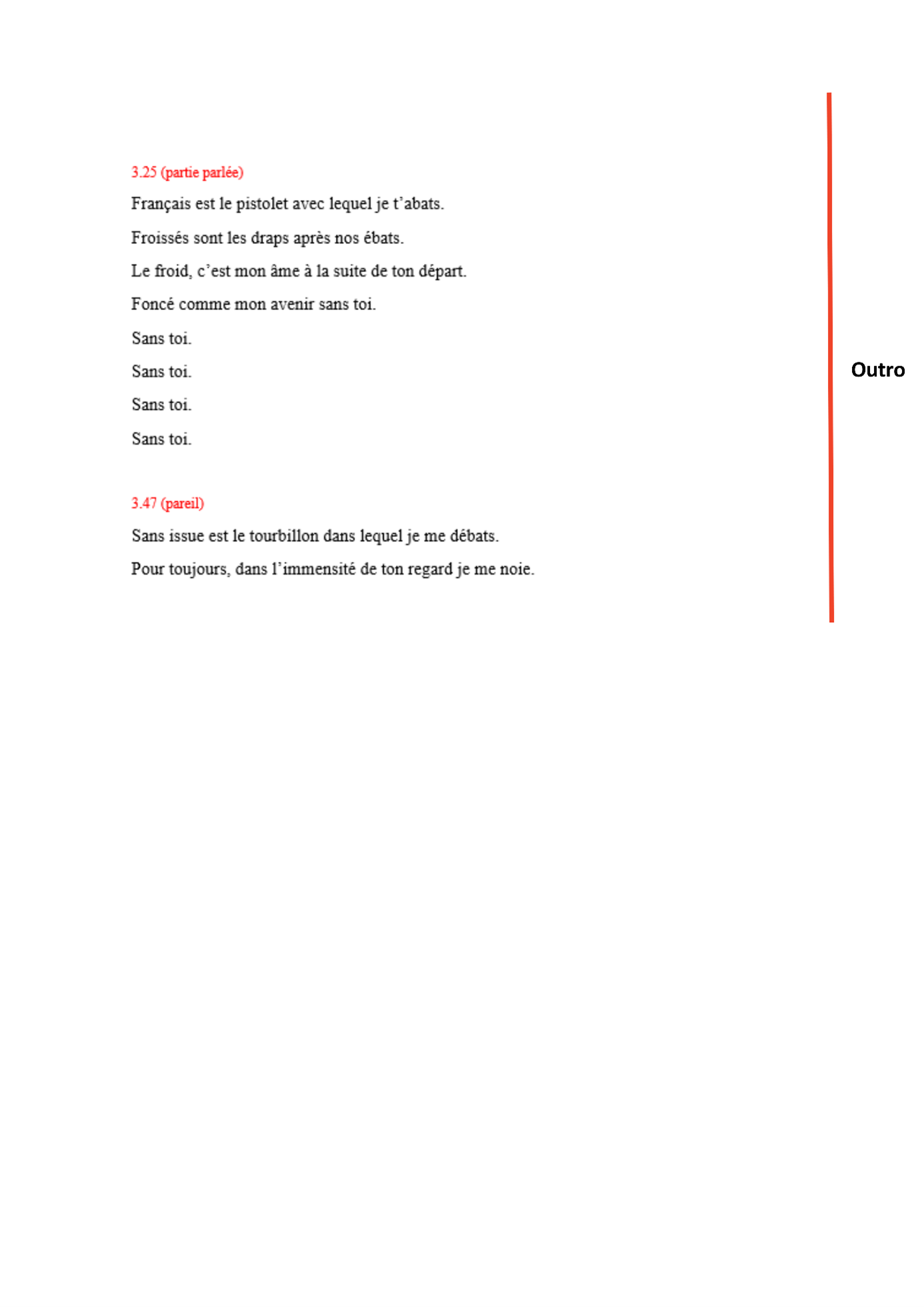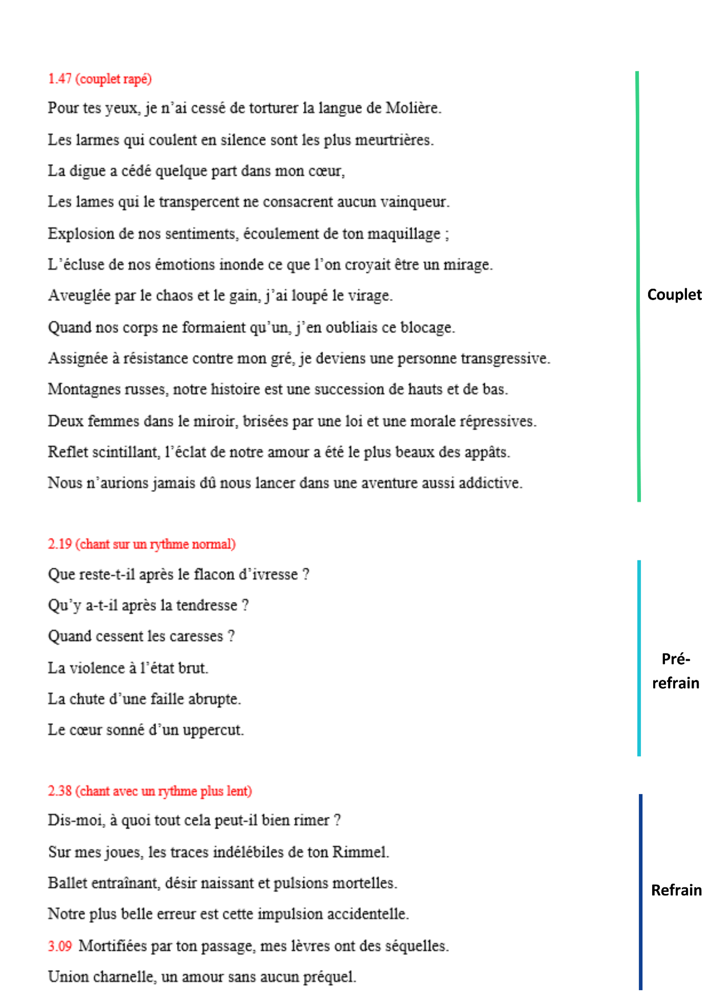 Malgré les indications de lecture, il est difficile de retranscrire fidèlement le rythme. Mais ça vous donne une idée. Vous remarquerez que j’ai changé quelques placements et ajouté du texte là où il n’y en a pas dans la version originale (au moment des deux dernières rimes du refrain à 1.32 et à la fin à partir de 3.25). Cette idée de l’outro, absente de l’originale, m’est venue dès l’écoute de l’instrumental, qui s’y prête ici totalement puisque Lomepal laisse presque une minute sans mot dans la dernière partie de sa chanson.